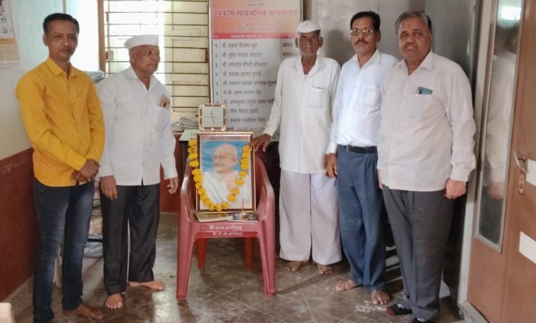 नीरा नरसिंहपूर:-येथील विकास सार्वजनिक वाचनालयाच्या वतीने अहिंसेचे पुजारी,..सत्य,..अहिंसा,.न्याय,..सत्याग्रह,..या तत्वावर भारताला स्वातंत्र मिळवून देणारे युगपुरूष महात्मा गांधी यांची जयंती वाचनालयाच्या परिसरातील स्वच्छता करून साजरी करण्यात आली.!..जेष्ठ सेवानिवृत्त शिक्षक नारायण खंडाळे सर यांचे हस्ते म.गांधी याच्या प्रतिमेचे पुजन केले.!..या प्रसंगी वाचनालयाचे कार्यवाह धनंजय दुनाखे,..तसेच कार्य.सदस्य डाॅ.अरूण वैद्य,..वाचक श्री.माणिक कोळी,सचिन कोळी,आनंद जोशी,सतीश गवळी,मगनदास क्षीरसागर ,श्रीमती सुतार ई.उपस्थित होते.